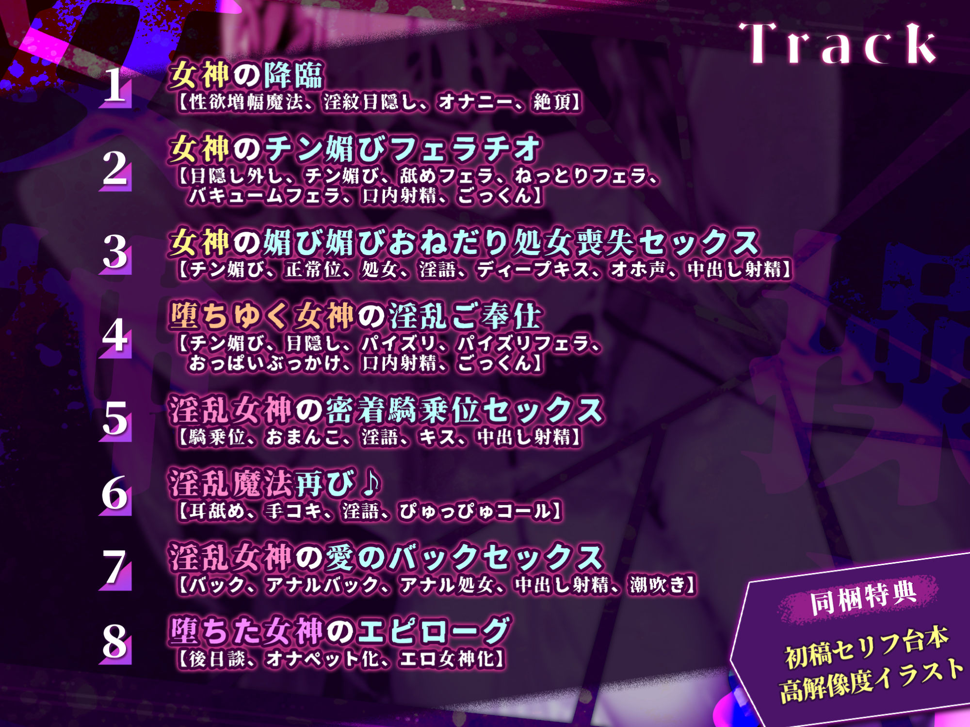 ジャンル: 処女、中出し、フェラ、アナル、パイズリ、退廃・背徳・インモラル、男性向け、成人向け、ASMR、バイノーラル、オホ声、メス堕ち